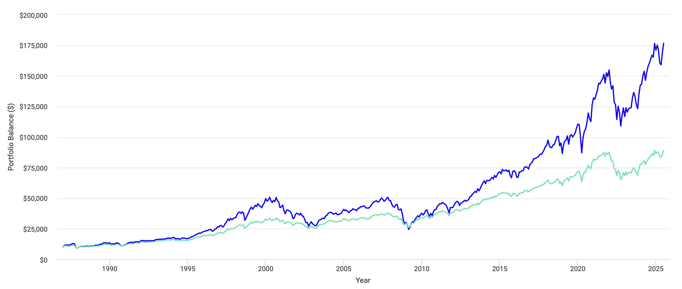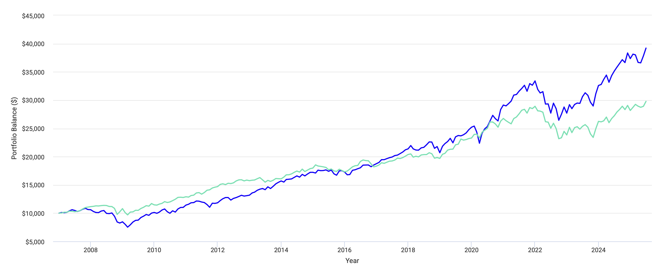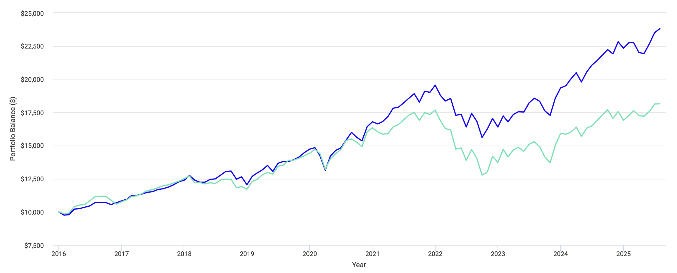 До 2021 года оба портфеля работали примерно одинаково с небольшим преимуществом у глобального портфеля в виде более низкой волатильности. Но затем между ними образовалась огромная пропасть. Это привело к тому, что вместо плановой доходности в 8-9%, я бы получил только 6.41%, в то время как 60/40 закончил период с результатом 9.47%.
