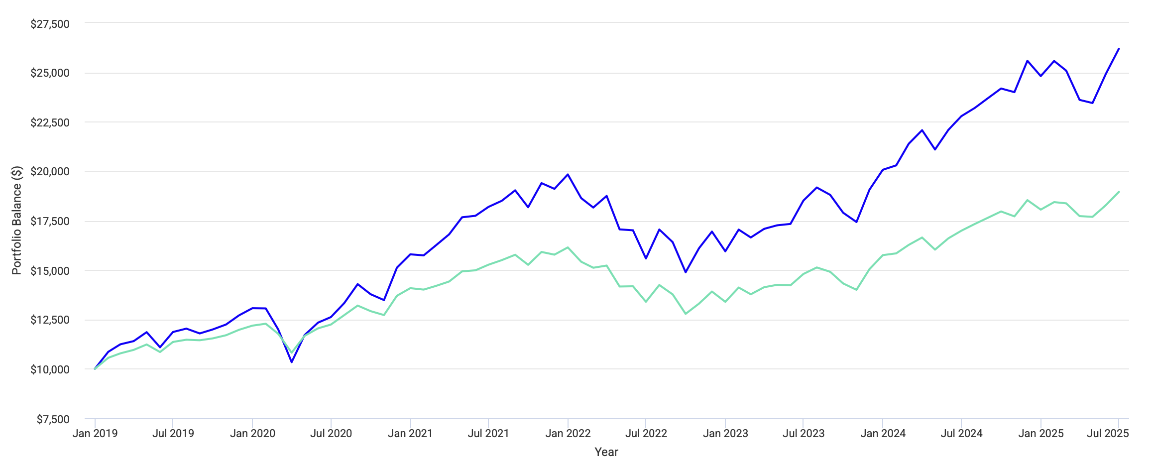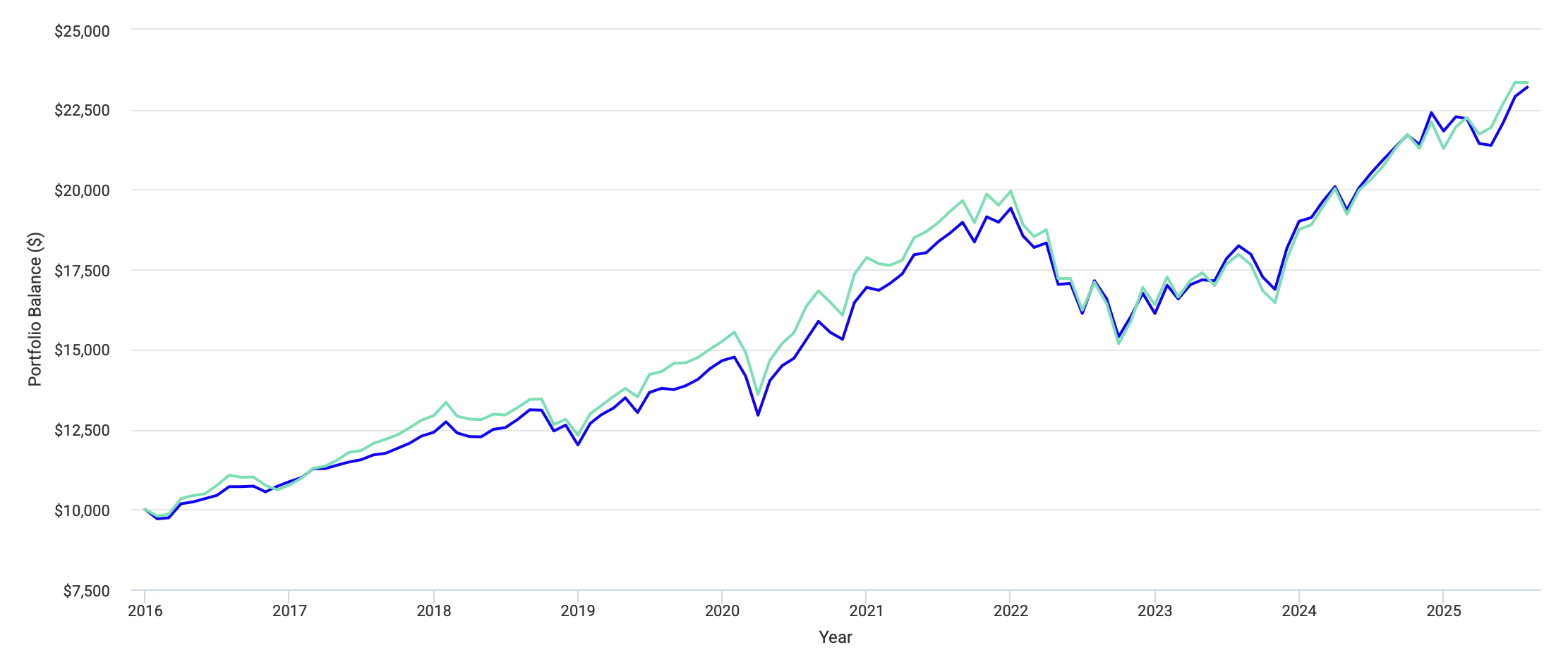 Вместо того, чтобы осмыслить это, я случайно наткнулся на пассивный портфельный подход. Почему-то тогда я поверил, что это и есть путь. Собрал несколько ETF и с тех пор ничего не менял. Портфель рос, я на него не тратил время. За 10 лет пассивный портфель принес мне 8,75% годовых в долларах. И вроде не о чем здесь переживать. Система работает прекрасно и зачем что-то менять?